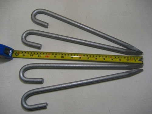 - Horog alakú karók: Ez a fajta karó elterjedt és könnyen használható. Egyes márkák és modellek a felső részen fényesre festettek, hogy könnyebben megtalálják a karókat a talajból. Ennek a karótípusnak az a hátránya, hogy a talajba illesztve a rúd helytelen használat esetén meghajolhat, túl kemény talaj esetén pedig kövekkel nem lehet ütni, a kör alakú rúd elfordulhat a talajban. , ami gyenge tapadást eredményez puha talajban, például sárban, homokban vagy hóban.
